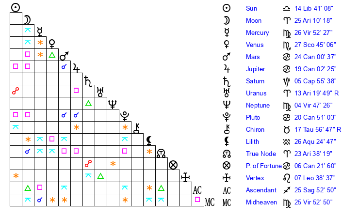 | Sun | 14 Libra 41 | 15 Libra 40 | 20 Capricorn 31 |
