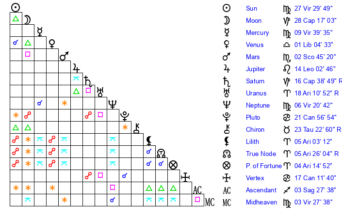 | Moon | 28 Capricorn 21 | 24 Virgo 21 | 25 Gemini 27 |