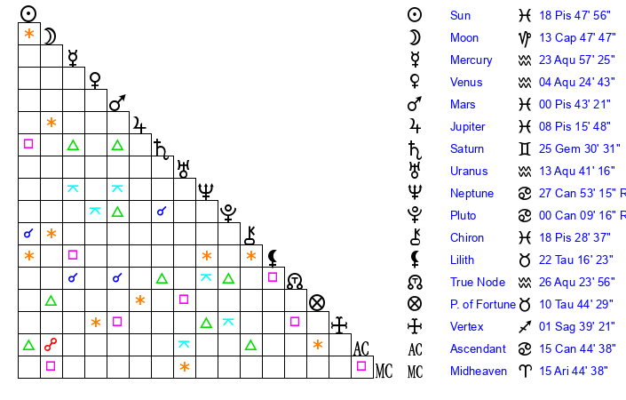 | Sun | 18 Pisces 48 | 20 Pisces 7 | 5 Cancer 39 |