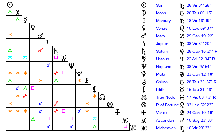 | Sun | 26 Virgo 31 | 27 Virgo 0 | 29 Sagittarius 39 |