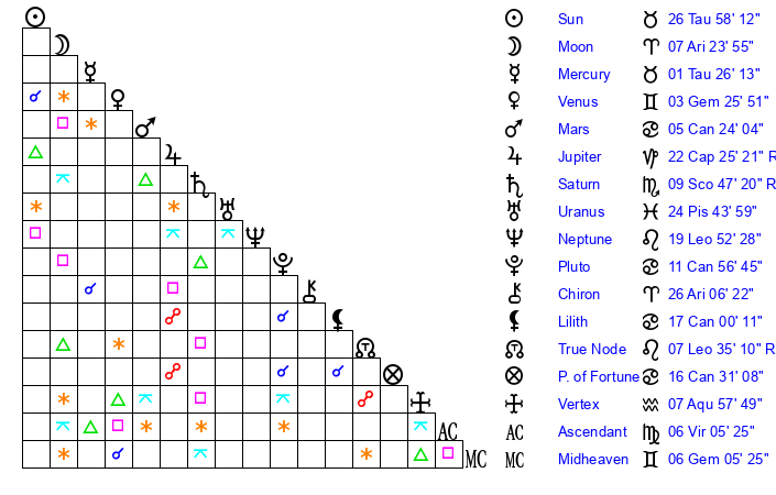 | Sun | 26 Taurus 58 | 27 Taurus 46 | 2 Virgo 40 |