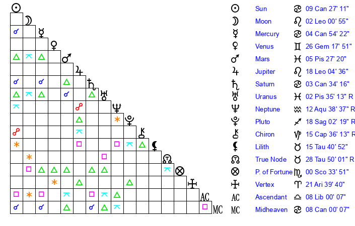 Venus | 26 Gemini 18 | 26 Taurus 46 | 23 Cancer 16 |