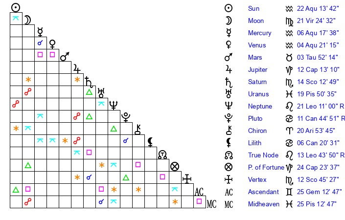 | Mercury | 6 Aquarius 18 | 24 Aquarius 29 | 6 Taurus 5 |
