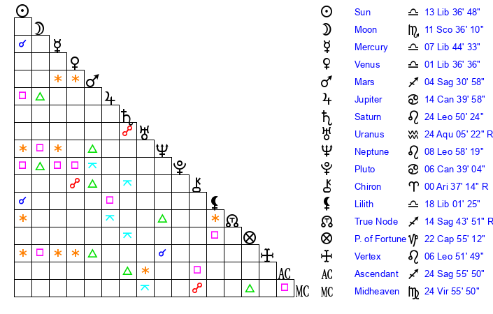 | Sun | 13 Libra 36 | 14 Libra 41 | 1 Aquarius 38 |