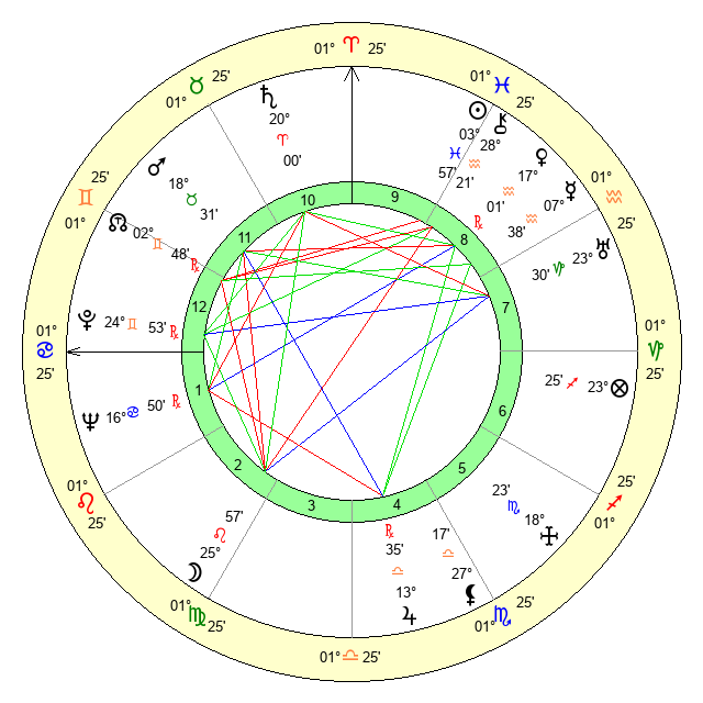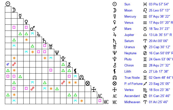 | Sun | 3 Pisces 58 | 5 Pisces 5 | 26 Gemini 19 |