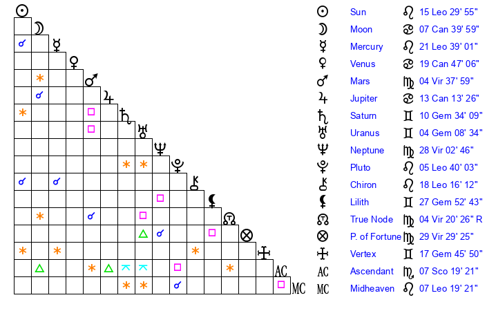 | Mercury | 21 Leo 39 | 4 Leo 37 | 19 Libra 4 |