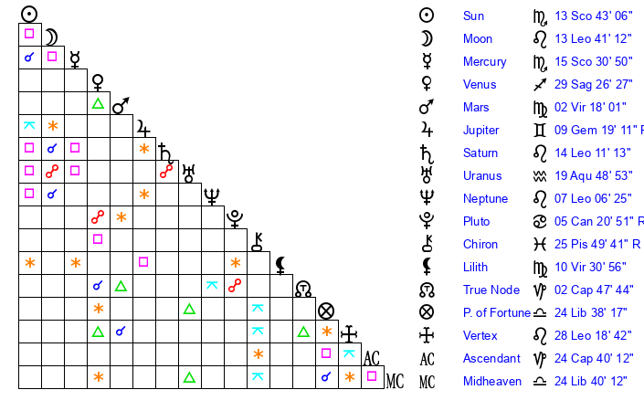 | Sun | 13 Scorpio 43 | 14 Scorpio 32 | 3 Pisces 16 |