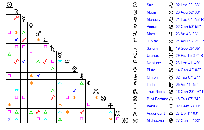 | Moon | 23 Aquarius 48 | 27 Leo 48 | 6 Libra 50 |