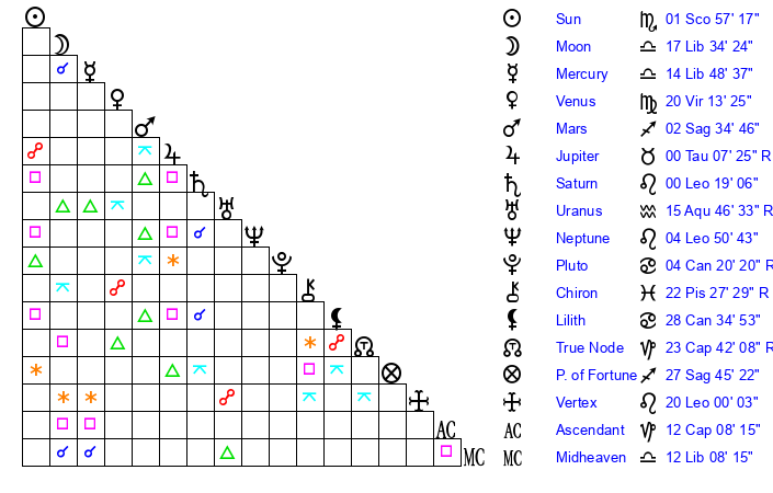 | Moon | 17 Libra 34 | 18 Sagittarius 11 | 12 Libra 42 |