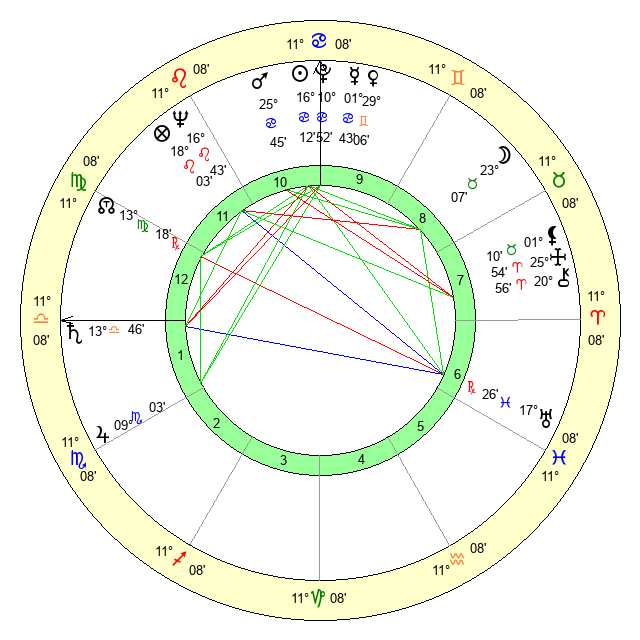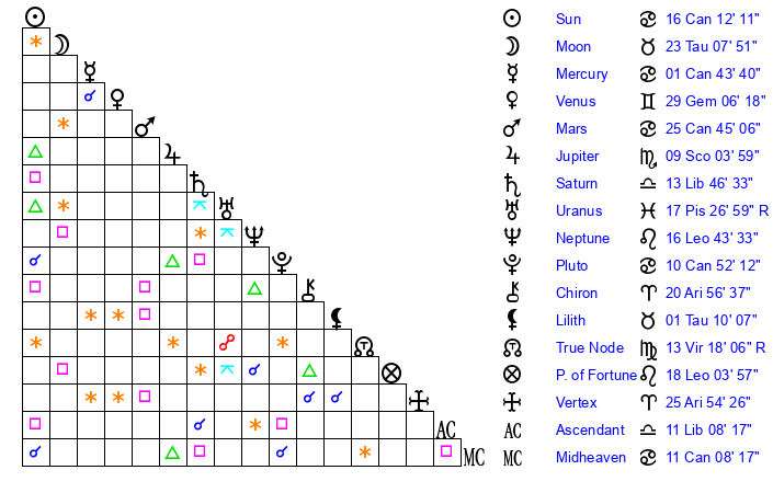 | Sun | 16 Cancer 12 | 17 Cancer 30 | 25 Libra 2 |