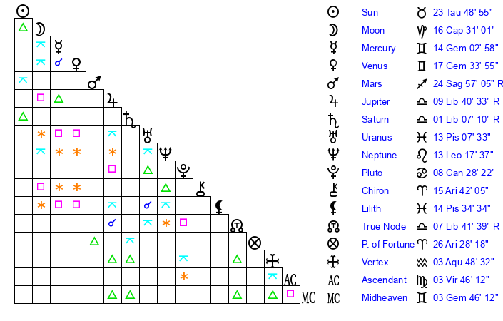 | Moon | 16 Capricorn 33 | 25 Sagittarius 26 | 22 Libra 40 |