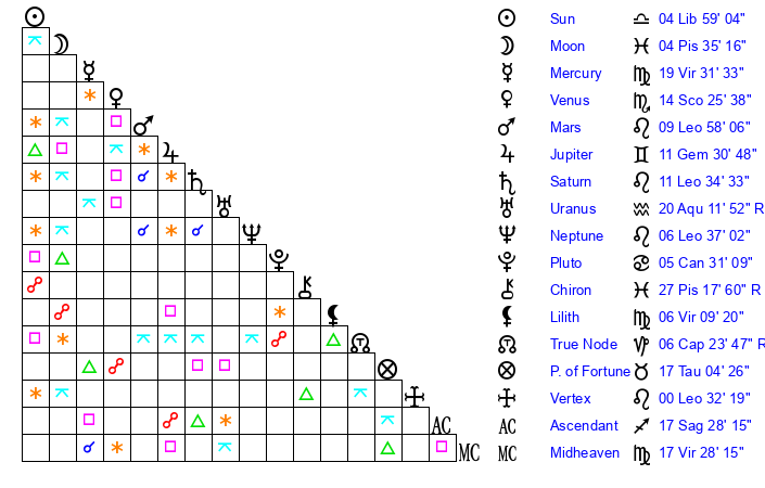 | Moon | 4 Pisces 40 | 21 Sagittarius 31 | 17 Aquarius 38 |