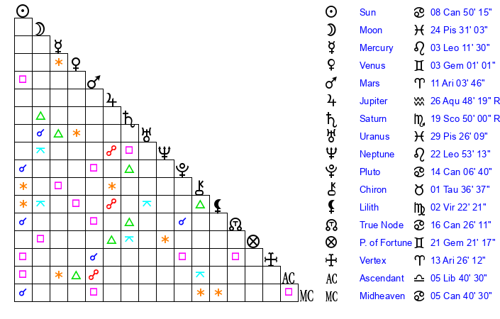 | Moon | 24 Pisces 30 | 24 Virgo 53 | 1 Scorpio 40 |