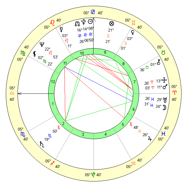 | Sun | 8 Cancer 50 | 9 Cancer 52 | 14 Libra 24 |