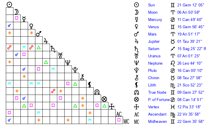 | Sun | 21 Gemini 12 | 21 Gemini 44 | 24 Virgo 18 |