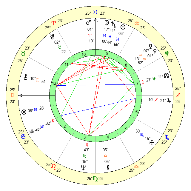 | Sun | 3 Pisces 55 | 5 Pisces 20 | 1 Gemini 23 |