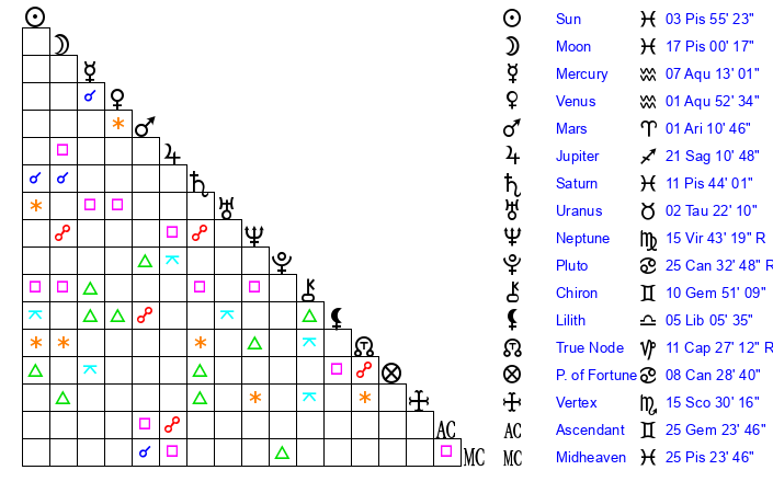 | Sun | 3 Pisces 55 | 5 Pisces 20 | 1 Gemini 23 |