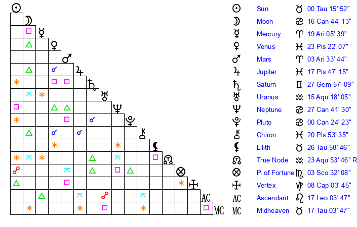 | Moon | 16 Cancer 39 | 6 Aquarius 11 | 28 Cancer 28 |