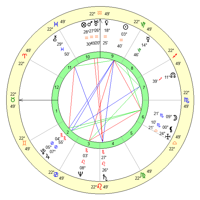 | Mars | 27 Aquarius 48 | 22 Cancer 53 | 18 Taurus 44 |