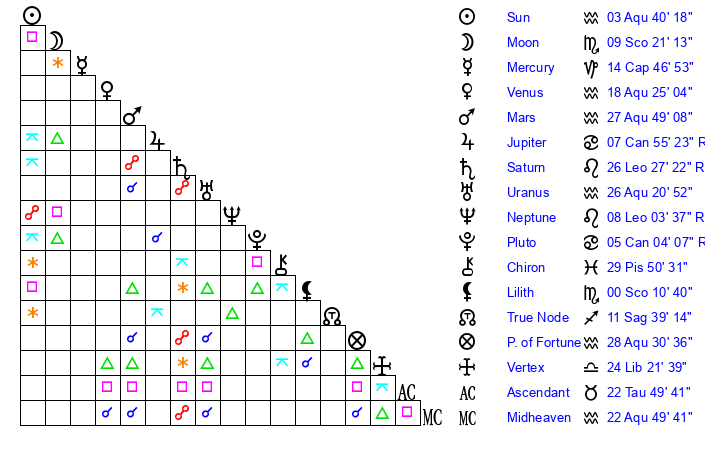 | Mars | 27 Aquarius 48 | 22 Cancer 53 | 18 Taurus 44 |