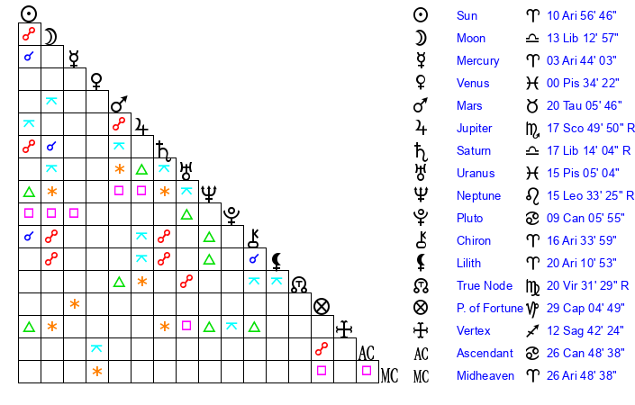 | Moon | 13 Libra 16 | 27 Taurus 52 | 3 Cancer 27 |