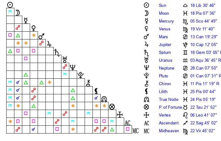 | Sun | 18 Libra 30 | 19 Libra 22 | 11 Aquarius 46 |