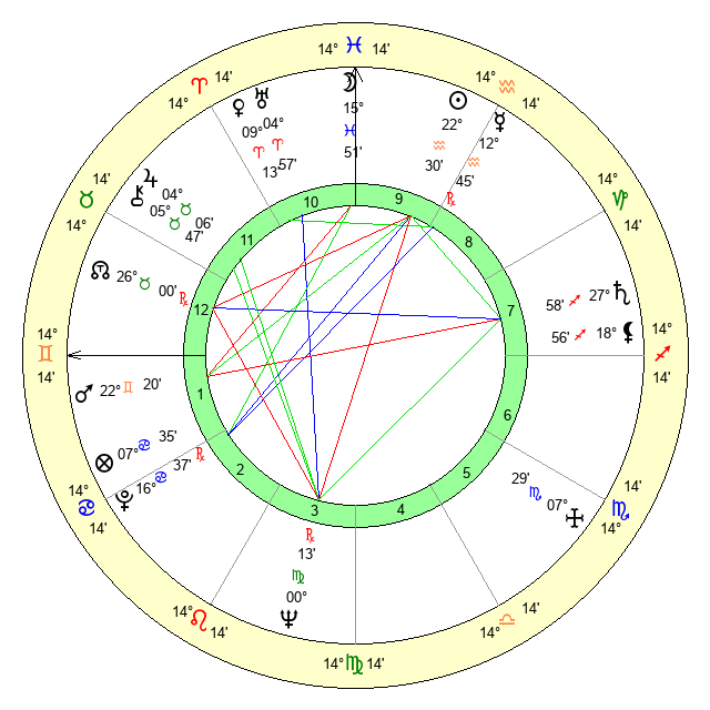 | Moon | 15 Pisces 54 | 12 Leo 54 | 2 Libra 14 |