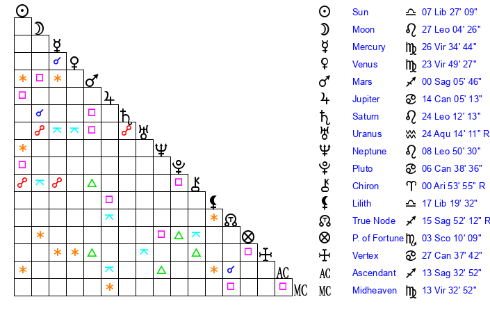 | Sun | 7 Libra 27 | 8 Libra 31 | 25 Capricorn 16 |