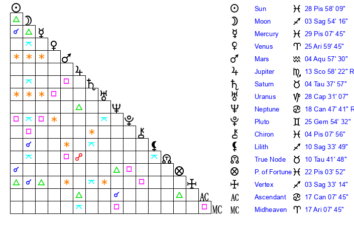 Sun | 28 Pisces 58 | 0 Aries 20 | 19 Cancer 12 |