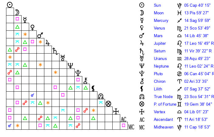 | Sun | 5 Capricorn 40 | 7 Capricorn 12 | 21 Aries 15 |