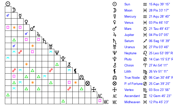 | Sun | 15 Aquarius 40 | 16 Aquarius 53 | 22 Taurus 39 |