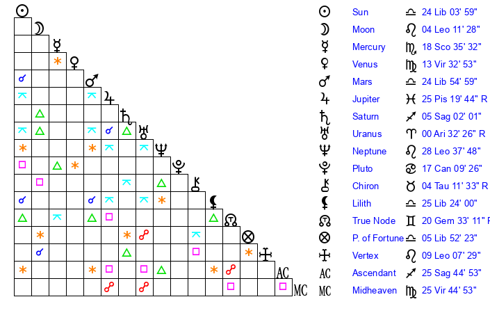 | Sun | 24 Libra 4 | 25 Libra 19 | 3 Aquarius 14 |