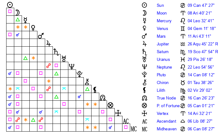 | Pluto | 14 Cancer 9 | 3 Aquarius 6 | 15 Cancer 56 |