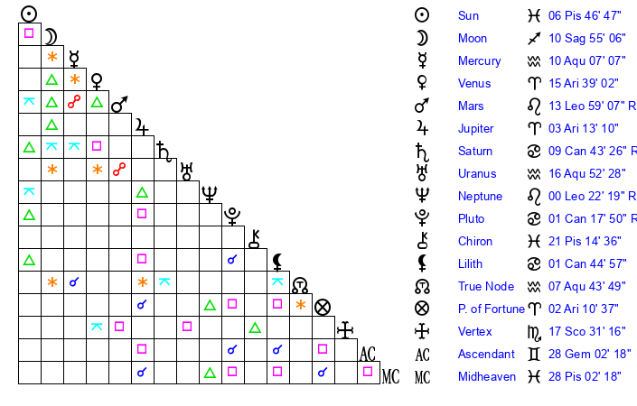| Sun | 6 Pisces 47 | 8 Pisces 21 | 23 Gemini 15 |