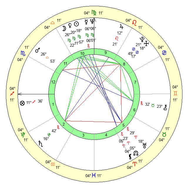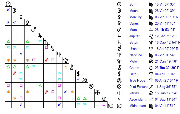 | Moon | 26 Virgo 16 | 27 Taurus 2 | 9 Pisces 18 |