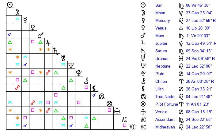 | Mercury | 27 Leo 33 | 24 Leo 39 | 23 Sagittarius 2 |