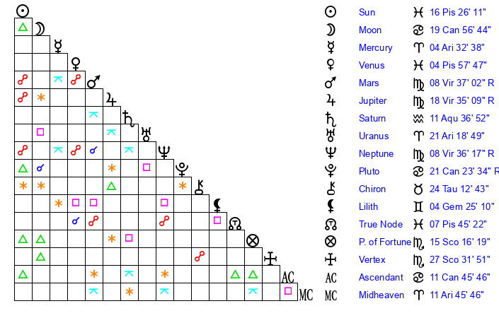 | Sun | 16 Pisces 26 | 17 Pisces 7 | 16 Gemini 13 |