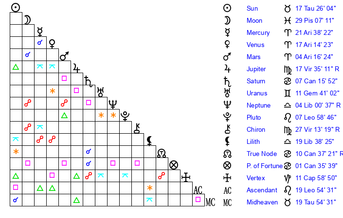 | Mars | 4 Aries 17 | 9 Leo 5 | 2 Gemini 46 |
