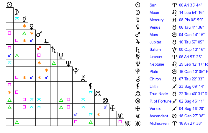 | Sun | 0 Aries 36 | 1 Aries 20 | 3 Cancer 37 |