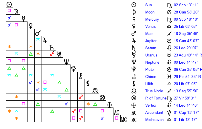 | Sun | 2 Scorpio 13 | 3 Scorpio 17 | 20 Aquarius 40 |