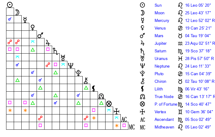 | Mercury | 12 Leo 51 | 4 Leo 26 | 11 Sagittarius 21 |