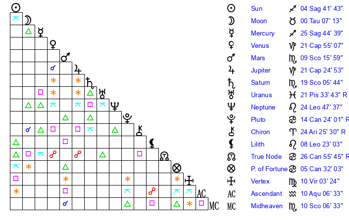 | Saturn | 19 Scorpio 34 | 12 Pisces 45 | 26 Scorpio 34 |