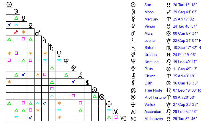 | Sun | 20 Taurus 13 | 21 Taurus 1 | 25 Leo 56 |