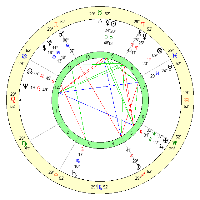 | Neptune | 19 Leo 49 | 1 Aries 24 | 22 Leo 27 |