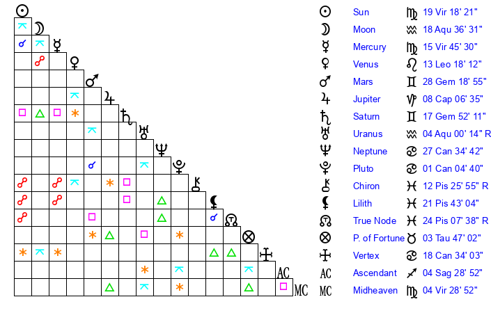 | Sun | 19 Virgo 18 | 20 Virgo 11 | 11 Capricorn 29 |
