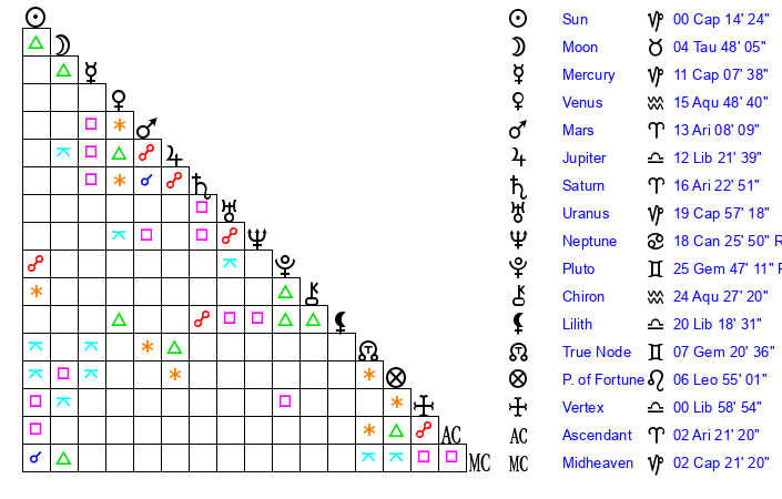 | Sun | 0 Capricorn 14 | 1 Capricorn 21 | 25 Aries 49 |