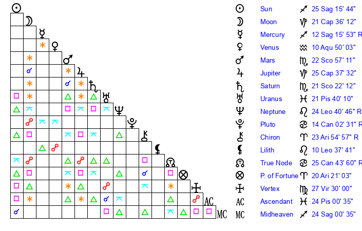 | Moon | 21 Capricorn 23 | 26 Cancer 16 | 5 Virgo 6 |
