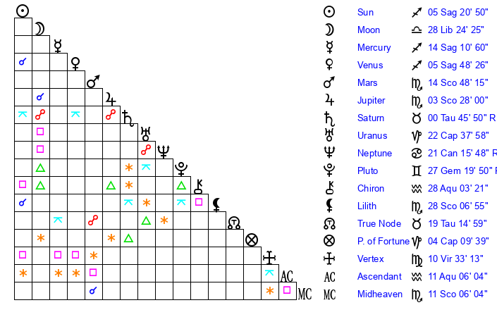 Moon | 28 Libra 24 | 5 Scorpio 18 | 24 Sagittarius 24 |