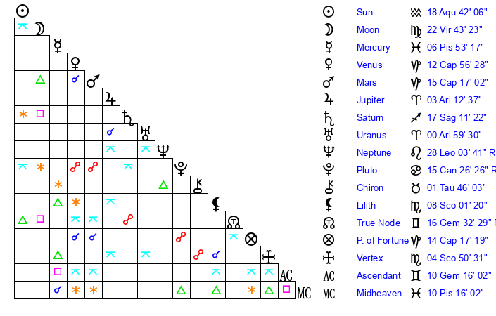 | Sun | 18 Aquarius 42 | 20 Aquarius 11 | 24 Taurus 35 |