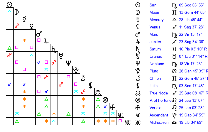 | Moon | 13 Gemini 32 | 16 Pisces 41 | 15 Virgo 55 |